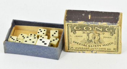 eight miniature bone carved dices and two others in a 'Gong' match box. -