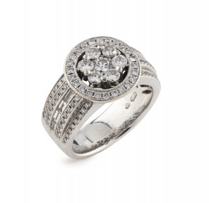 Designed as a target ring, internal diamond set floral cluster, shoulders set throughout with rows of round brilliant and baguette cut diamonds, total approximate diamond weight 0.80cts; 18ct white gold. Stamped RT.