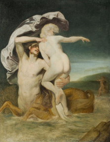 Old paper labels to stretcher incl. "G ROMNEY, 117. NESSUS AND DEJANIRA - a sketch, 36.5 in. by 28 in." This is cut from the catalogue of the W J Long sale at Christies, 28th June 1890, where this work was lot 117, and sold as a work by Romney. W J Long was a descendant of Romney's friend, the surgeon William Long. This work was purchased by the art dealer Charles Davis for 65 pounds, 2 shillings. Some of the attributions to Romney in this catalogue have been challenged by scholars art historians.