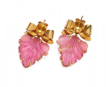 The gold bow surmounts suspending a carved pink tourmaline of foliate design, signed White, gross weight approximately 15.50 grams, mounted in 18ct gold, length 3.50cm. -