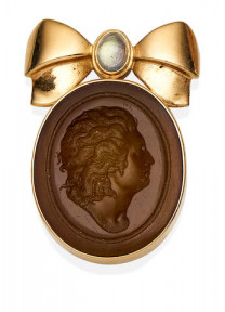 The brown glass intaglio depicting a female profile in classical taste, topped with a gold bow set with an oval moonstone cabochon, signed White, gross weight approximately 20.80 grams, mounted in 18ct gold, length 4.50cm. -
