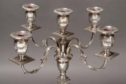 hallmarked Birmingham, 1979, B.E//S Co (Barker Ellis Silver Company) in neoclassical taste, set with central sconce flanked by four branched sconces on column support accented with urns, garlands, rams heads and ribbons, all pieces marked, height 48cm -