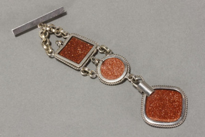 with square, circular and diamond form panels suspended from a bar brooch, total length 10.5cm -