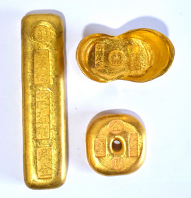 Lot Description:Three Chinese Gold Colour Metal Bars, Qianlong, Xianfeng, Xuantong Marks