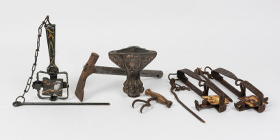 Lot Description:A collection of ironwork including two rabbit traps, a painted rabbit trap, a mallet, a cast iron bath tub leg and a bail pick