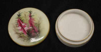 hand painted 'Heath' decoration to lid, base and lid marked for Royal Worcester, circa 1900, (diameter 4cm approx). -
