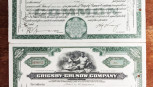 1918, Marconi Loan, face value £500, serial number 001531. Poor condition, with later coupons. Together with two Vintage share certificate stock bonds Grigsby-Grunow Company dated 1932, numbered C091655-56. -