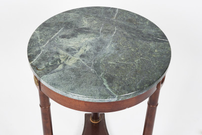 green marble circular top, above a three legs and platform base, gilded metal mounts, minor chip to marble