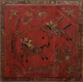 gouache on paper; together with a Chinese wood panel hand painted with warriors against a red ground (2)