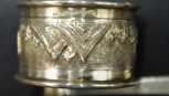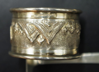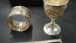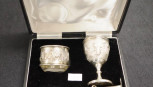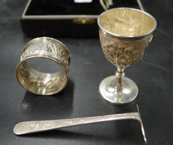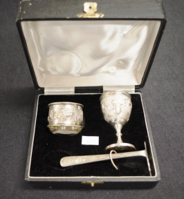 including three decorated pieces, each marked 'sterling silver,' comprising an eggcup, napkin ring, and food pusher, (no engraved monograms evident), in fitted case, (weight 90grams approx, total). -