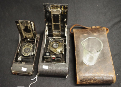 including: 'No 1A 'Pocket Kodak,' and a folding 'Pocket Kodak Autographic' with leather case; together with a glass Kodak Australasia calibrated measuring beaker, marked 'for photographic use only,' (height 10cm approx). -