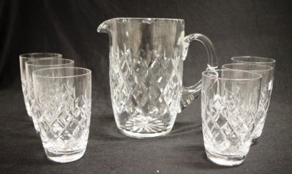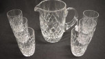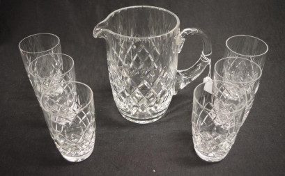 including: water jug, and set 6 matching cut crystal water glasses, (height 12cm approx, each). -