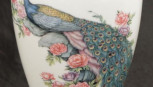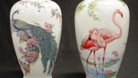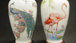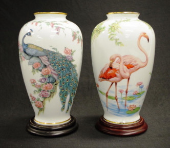 including: 'The Imperial Flamingo Vase,' and 'The Imperial Peacock Vase,' each marked to base, with fitted wood stands, (height 27cm approx, each). -