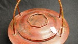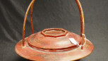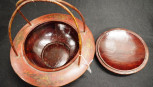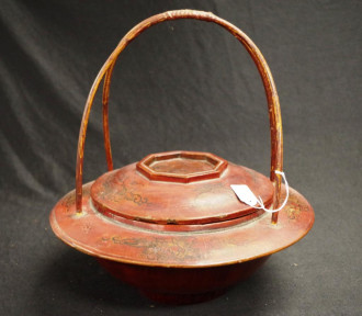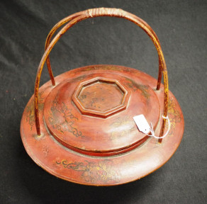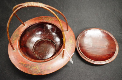 traditional hand painted decoration to lacquered wood lid, and circular bowl below, with cane handles, (height 34cm; diameter 31cm approx). -