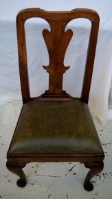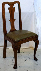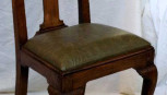on cabriole legs, with solid splat and dished top rail, upholstered with green leather, 53cm wide, 101cm high approx -