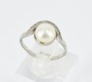 set with a cultured button shaped pearl and marcasite on silver. Size M-N. Weight 2.8 grams. -