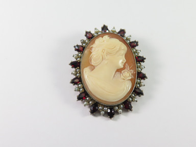 an oval profile portrait of a lady within a garnet and pearl border; garnet trefoil pendant loop; silver-gilt. 48 x 33mm. Weight 12.67g. -