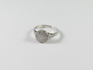 a brilliant cut diamond grain set within eight single cut diamonds and with a diamond to each shoulder; 18ct white gold. Bezel 8.5mm. Size H1/2. Weight 2.37g. -