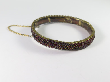 set all round with three rows of rose-faceted garnets; a total of 162 garnets. Width 9.5mm. Internal dimensions 58 x 47mm. (cased for Watters, Edinburgh) -