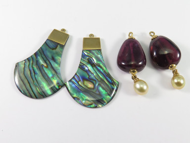 a pair of paua shell and 18ct gold scimitar drops signed White 750 (length 41mm); and a pair of gold-mounted garnet and pearl drops (length 35mm). (2)