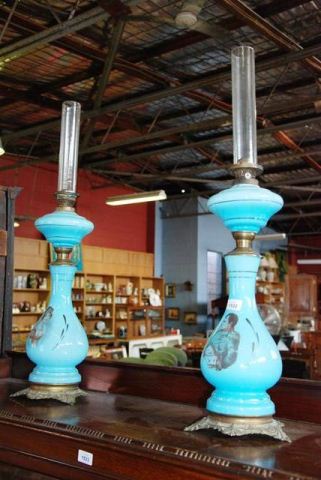 Lot Description:Antique pair of oil lamps, blue glass, decorated