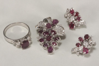 comprising ring with central stone in four claw setting, with diamonds to either side, size M, pendant in the form of grapes with foliage, height 3cm and a pair of earrings, height 1.9cm, all accented with small diamonds, total weight 13.19gm -