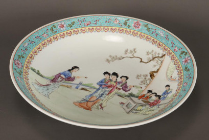 of circular form, decorated with central scene of court ladies in a garden setting, surrounded by ruyi head and floral borders, in tones of blue, orange, yellow and turquoise on a white ground, mark to base, diameter 40cm -
