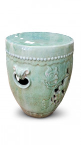 of barrel form, with pierced floral motifs and and mask handles, in a green mottled glaze -