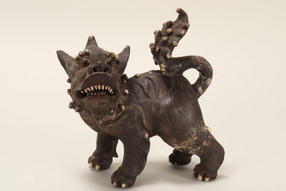 depicted on all fours with head and tail raised, in a brown and white glaze, length 21cm -
