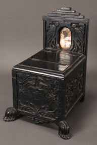 in the form of a throne with double hinged cover, in a stained ebony finish, carved with foliate and bird motifs, carved 'A Section 1945' to front shield, 35cm x 26cm x 24cm -