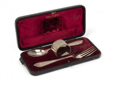 comprising a spoon, a fork and a napkin ring, each piece monogrammed 'PMB', in a leather fitted case