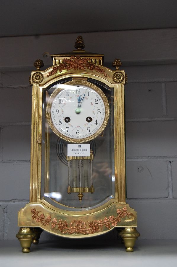 brass & glass mantle clock, presentation inscription dated 1902. 49.5cm high -