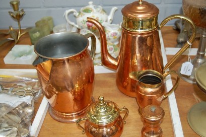brass items. Comprising coffee pot, water jug, pepper mill ; sugar pot and milk jug. (5) -