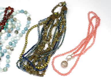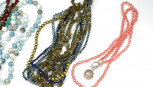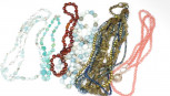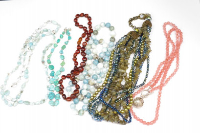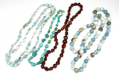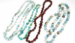 approx includes: turquoise nugget and silver necklace 38cm, heat treated cognac amber necklace 40cm, two pairs of costume faceted beaded necklace, blue white ornamental gemstone beaded necklaces 62 & 76cm -