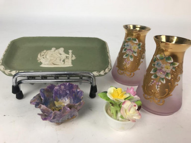 Lot Description:A Wedgwood Jasperware soap dish together with a pair of pink bud vases and a ceramic flower