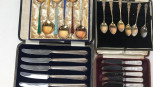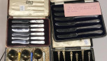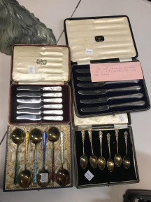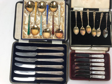 Lot Description:A collection of cased pâté knives and enamel dessert spoons together with silver plated cutlery