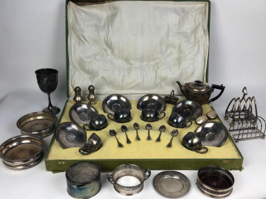Lot Description:A large collection of silver plated tableware together with a cased silver plated demi tass set from Granada