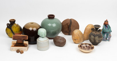 Lot Description:An assembled group of glazed earthenware, glass, ceramics and carved wood ornaments