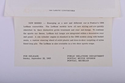 Lot Description:PONTIAC: A black and white press photograph of a 1963 LeMANS CONVERTIBLE