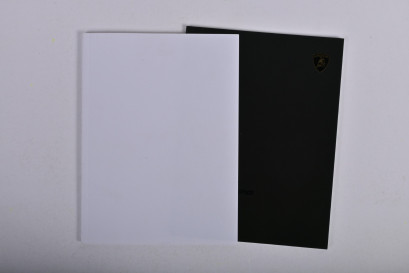 black and white, black covers and background, multi page, specifications to rear; with white paper sleeve.