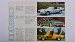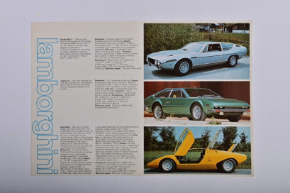 double-sided Lamborghini model range sales brochure as produced by Lamborghini (G.B.) Ltd, colour, colour pictures and specifications for Espada Mk.II, Jarama 'S', 'Countache', Urraco models; slight paper loss.