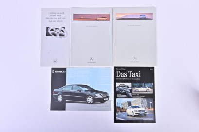 including two 1998 sales brochures detailing the 'E-Class T-Modelle' and 'E-Klasse Limousinen', both colour with model sales narrative, technical data, dimensional data, both with German text, 2016 'Das Taxi' sales brochure detailing Mercedes-Benz E-Class taxi model, colour with sales narrative, Mercedes- Benz Taxi history, 15 page, German text, with 'TRASCO' Armoured Saloon single sheet brochure with model picture; and one other. -