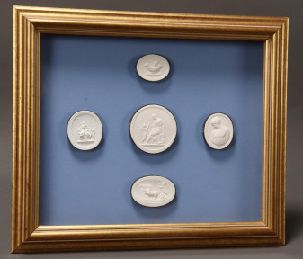 each depicting classical scenes, diameter 6cm (plaque) and 29.5cm x 35cm (frame) -