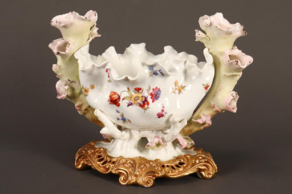 of organic form with a pinched rim, decorated with colourful floral sprays, flanked by twin coral branches, above a pierced gilt rococo base, mark to base, a/f (some age cracks to bowl), height 21cm and length 24cm -