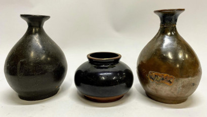 Notes:Condition: Kiln blemishes & chipping, the neck of the lighter brown vase has been repaired and the pot & vase have a hole in each as per photo the last photograph.