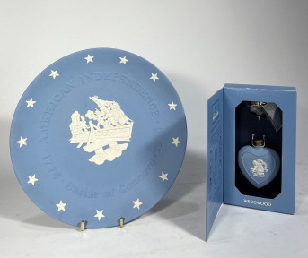 Lot Description:A Wedgwood Jasperware American Independence Day Battle of Concord 1776 Commemorative Plate & Cupid Perfume Bottle