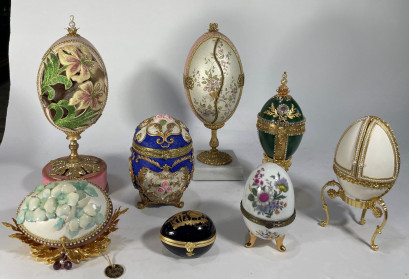 Lot Description:A Collection of Ornately Decorated Egg Ornaments, Trinket Boxes & Clock Incl. Limoge