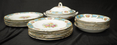 including: 6 each: dinner plates, entree plates, and soup bowls, together with a lidded vegetable tureen, each marked to base. -