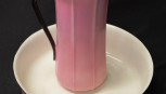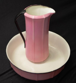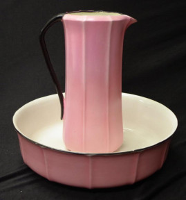 pink ceramic decoration, marked to bases, (diameter 40cm approx, wash basin), and (height 33cm approx, water jug). -
