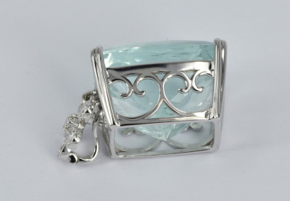 32ct cushion cut Aquamarine. On 14ct white gold. Colour of diamonds: Si G. Length, 3.0mm. Depth, 19mm. Weight, 11.3 grams. -